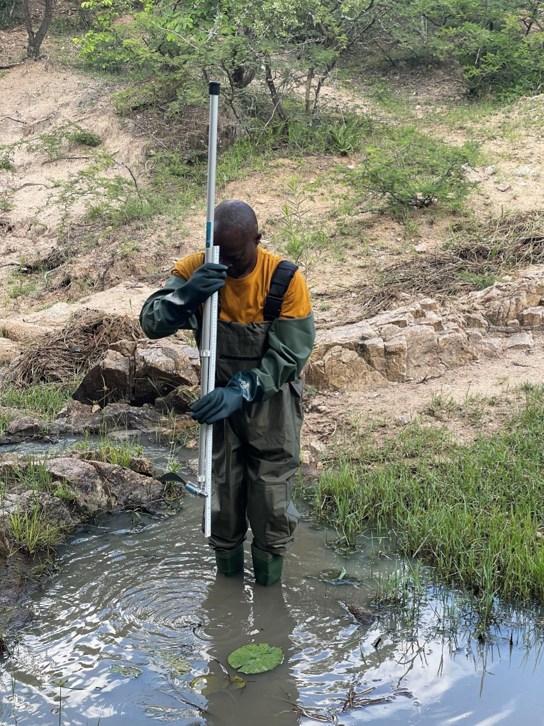 Dr. Innocent Wadzanayi Nyakudya, a member of the biodiversity research team, measures river flow of the Mtshabezi River in Gwanda District. Flow rate of a river is an important characteristic for understanding the biological community of a river.