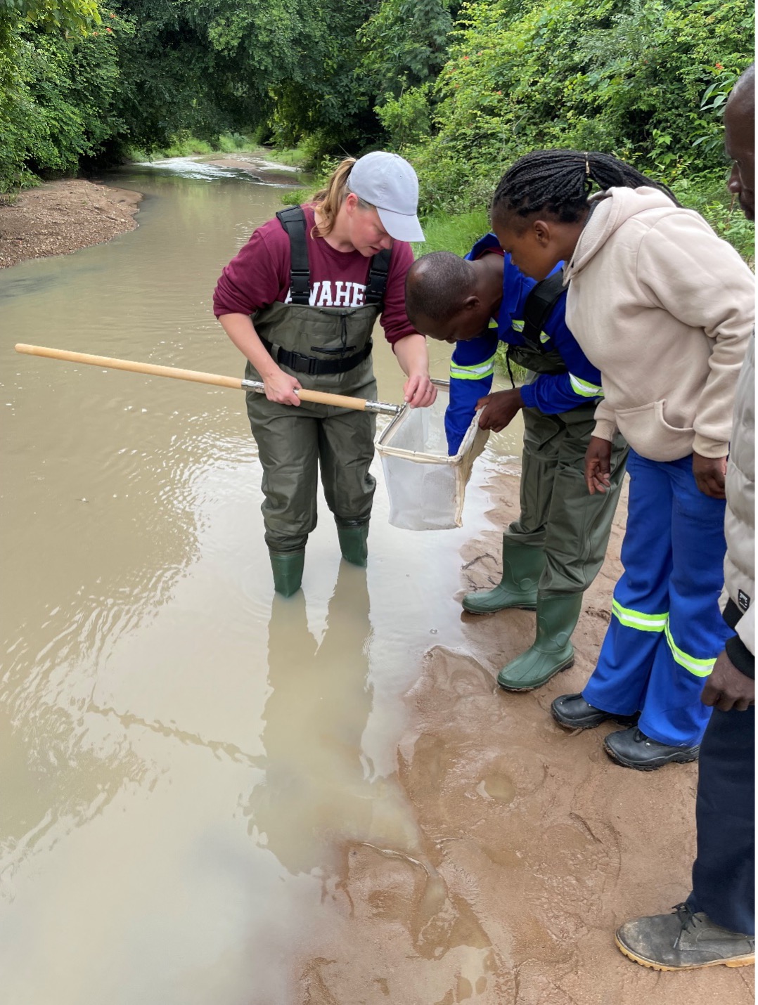 We used a sweep net to collect river invertebrates in different habitat types within each river, as pictured here in the Mtshabezi River in Gwanda District. We found a variety of invertebrates, such as diving beetles in the water column, water striders in the grasses along the banks, and dragonfly and mayfly larvae along the riverbed.